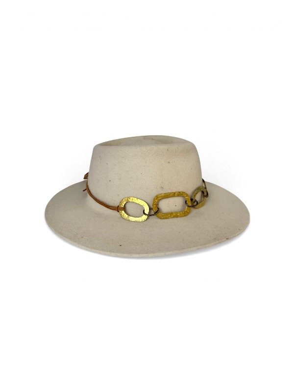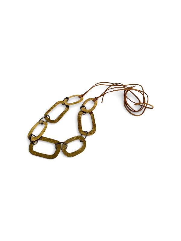 Cadena de bronce y eslabones metálicos plateados. Sujetados por cinta de cuero marrón.